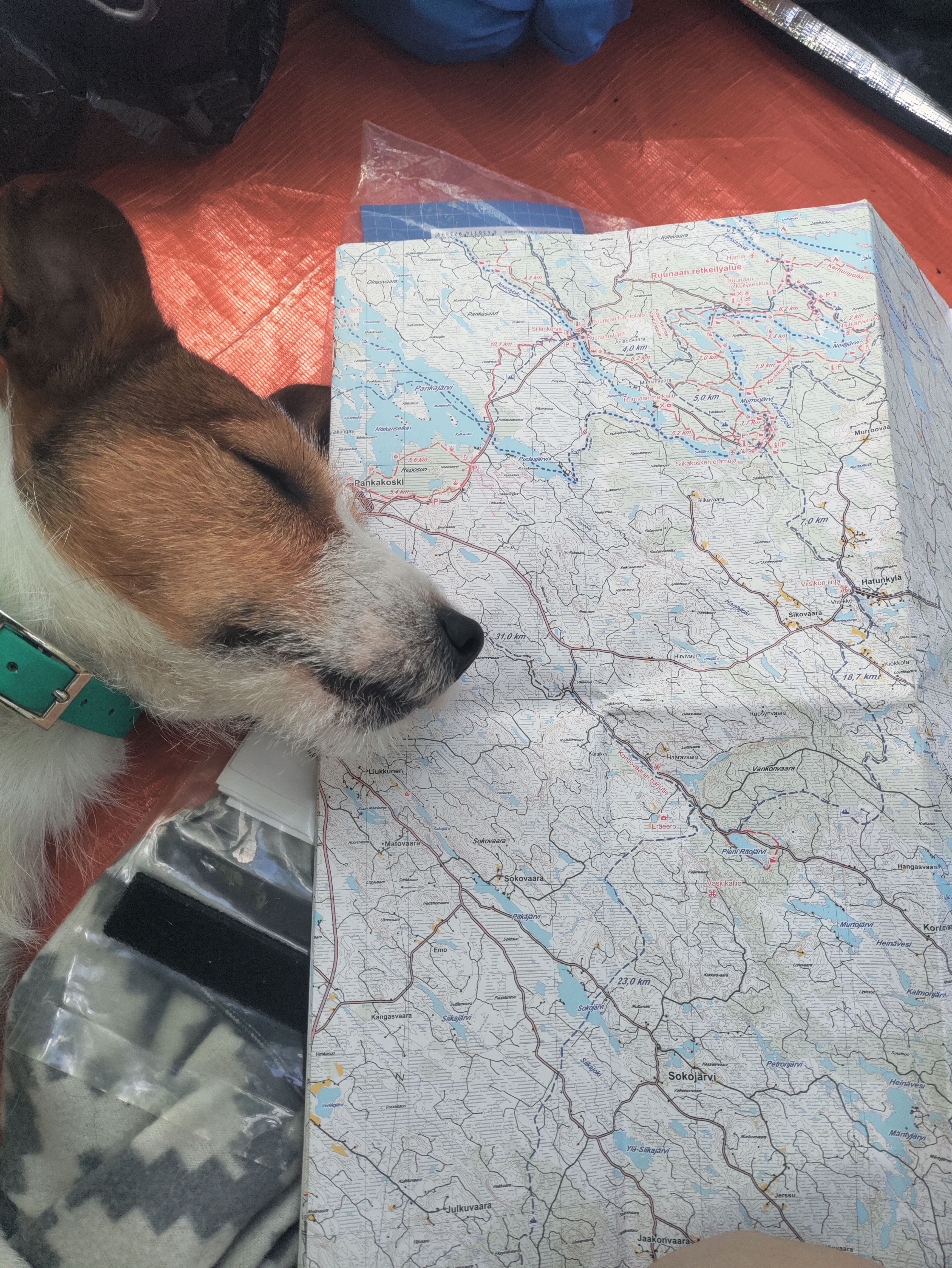 Päivän patikka noin 19,5km. Koirat on ihan tööt. Ei ole yhtään nälkä, oon syönyt lähinnä leipää, mutta nyt pitää tehdä lämmin ruoka vaikka väkisin. Mukana oli myös parmesanjuusto, joka on säilynyt hyvin, mutta ei ole tehnyt yhtään mieli edes sitä. Tein valmismunakokkelin, joka oli hyvää, mutta sitä oli liikaa. Onneksi mulla on pari avustajaa. Lakki on ruvennut syömään hirveän hyvin. Muistan että ainakin Nuorttilla sen ollessa nuori sille oli kissan märkäruokaa mukana, kun se oli huono syömään ja rasitus vaikutti vielä niin että syöminen huononi entisestään. Se oli tosi stressaavaa, joten katsoin ilolla pelkkää nappulaa hotkivaa koiraa.